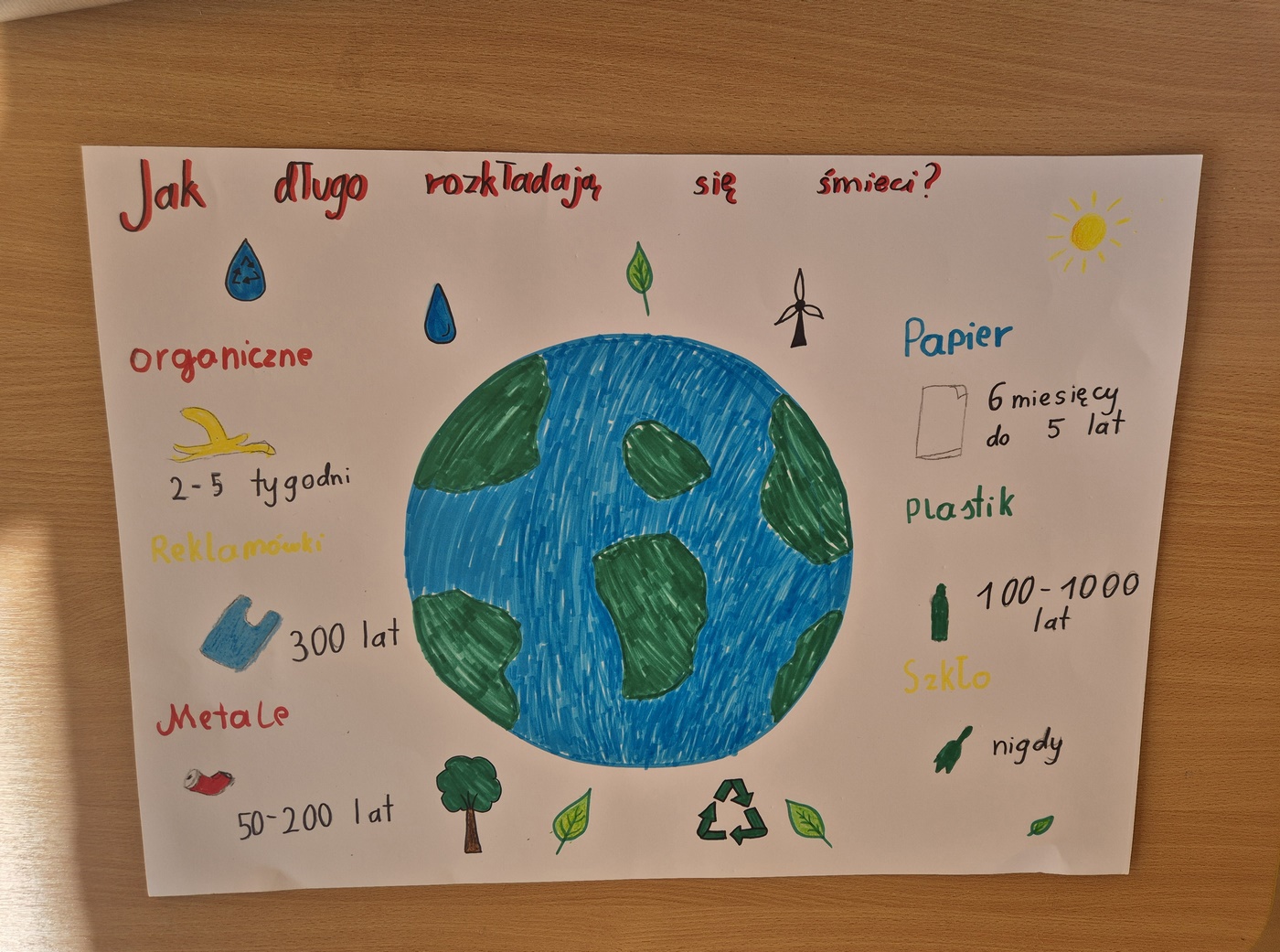 W trakcie zajęć nie zapomniano również o edukacji ekologicznej w bardziej tradycyjnej formie. Uczniowie przygotowywali plakaty poświęcone ochronie środowiska, zwracając uwagę na znaczenie dbania o naturę, ograniczania odpadów oraz odpowiedzialnego korzystania z zasobów naszej planety.